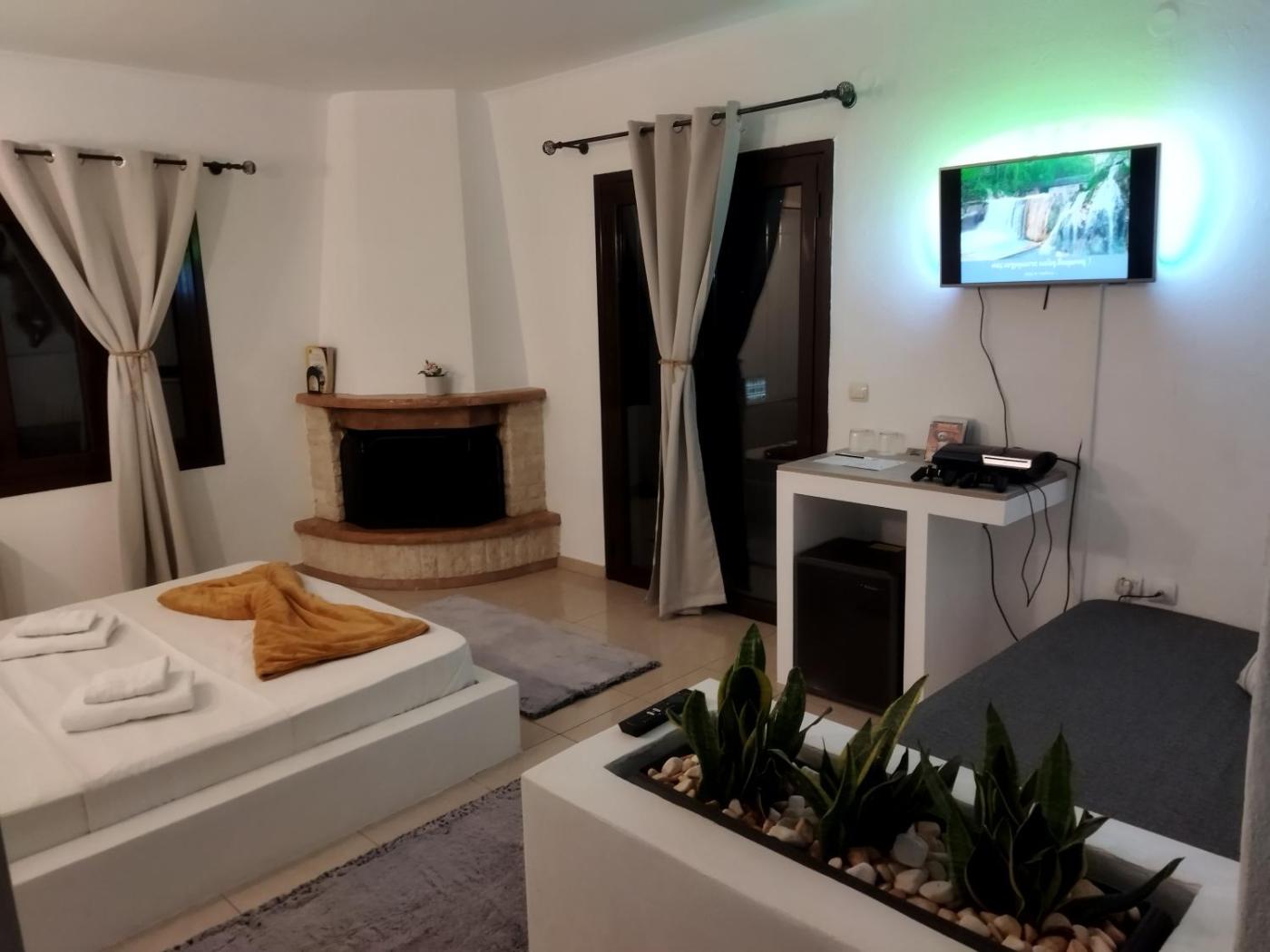 Deluxe Room with Spa Bath and Fireplace. Featuring a fireplace and spa bath, this air-conditioned room opens to a balcony or patio with pool, garden or Kaimaktsalan Mountain views. It offers: - free Wi-Fi - satellite TV - mini fridge - bathrobes. ;